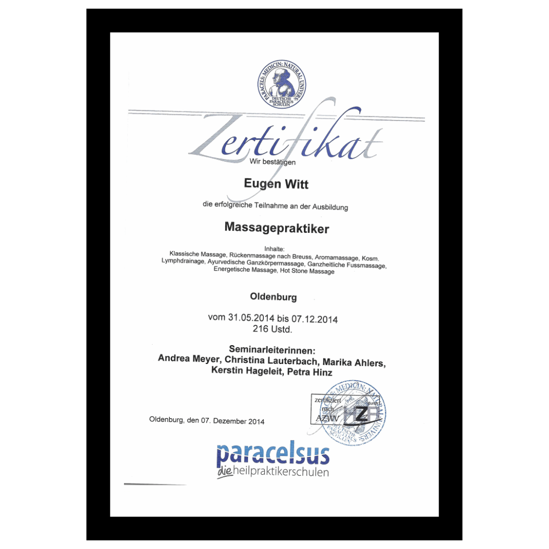 Meine Massagen verbinden gezielte Fachkenntnisse mit echter Leidenschaft. Durch regelmäßige Weiterbildungen und anerkannte Zertifikate garantiere ich dir fundierte Techniken, die wirken. Mit vielen erfolgreich durchgeführten Massagen konnte ich bereits unzähligen Menschen helfen, Verspannungen zu lösen und neue Beweglichkeit zu gewinnen.